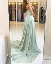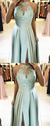 Long Halter Sage Green Prom Dresses Lace Chiffon Formal Dresses