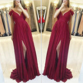 Simple A-line Off-the-Shoulder Chiffon Burgundy Prom Dresses