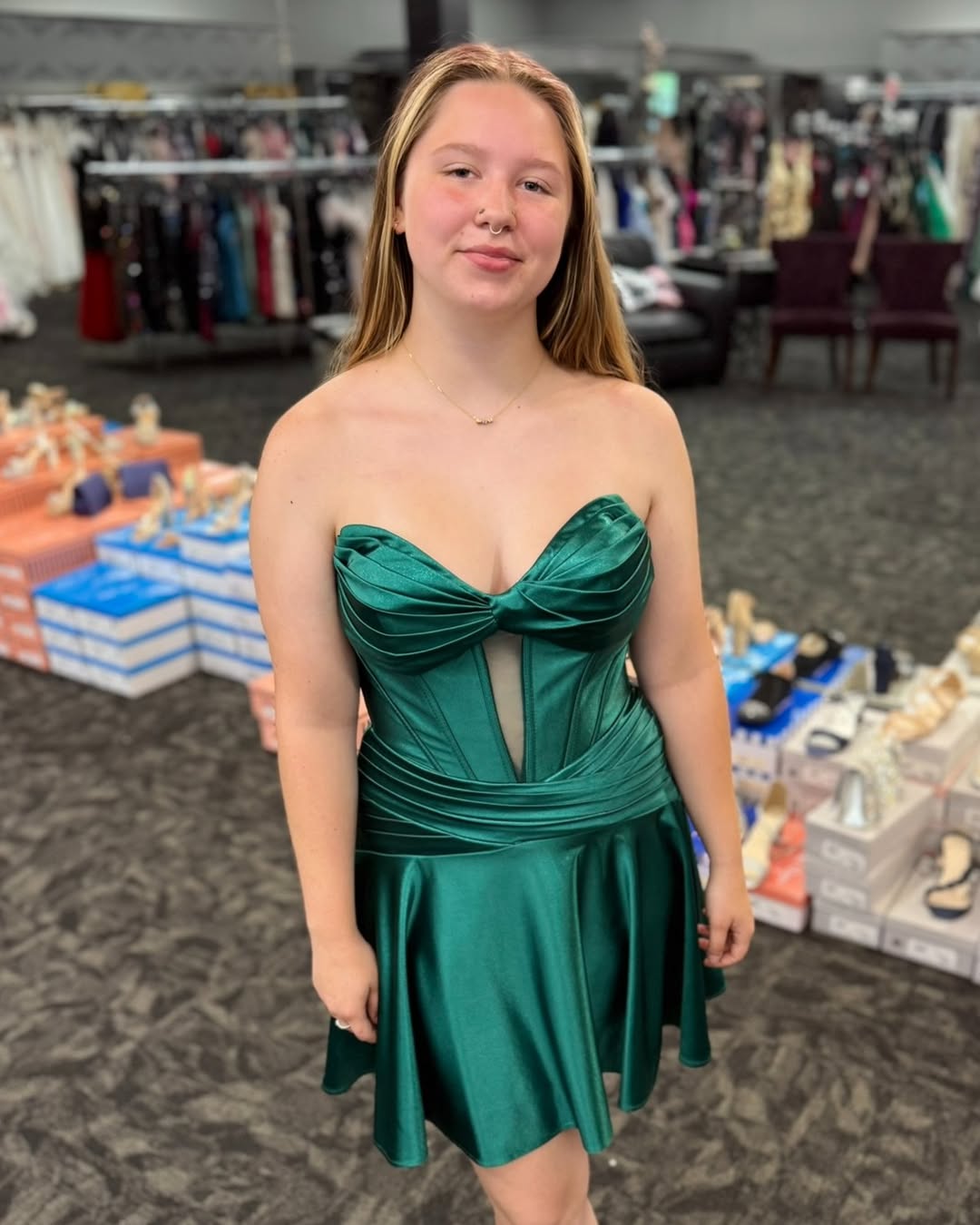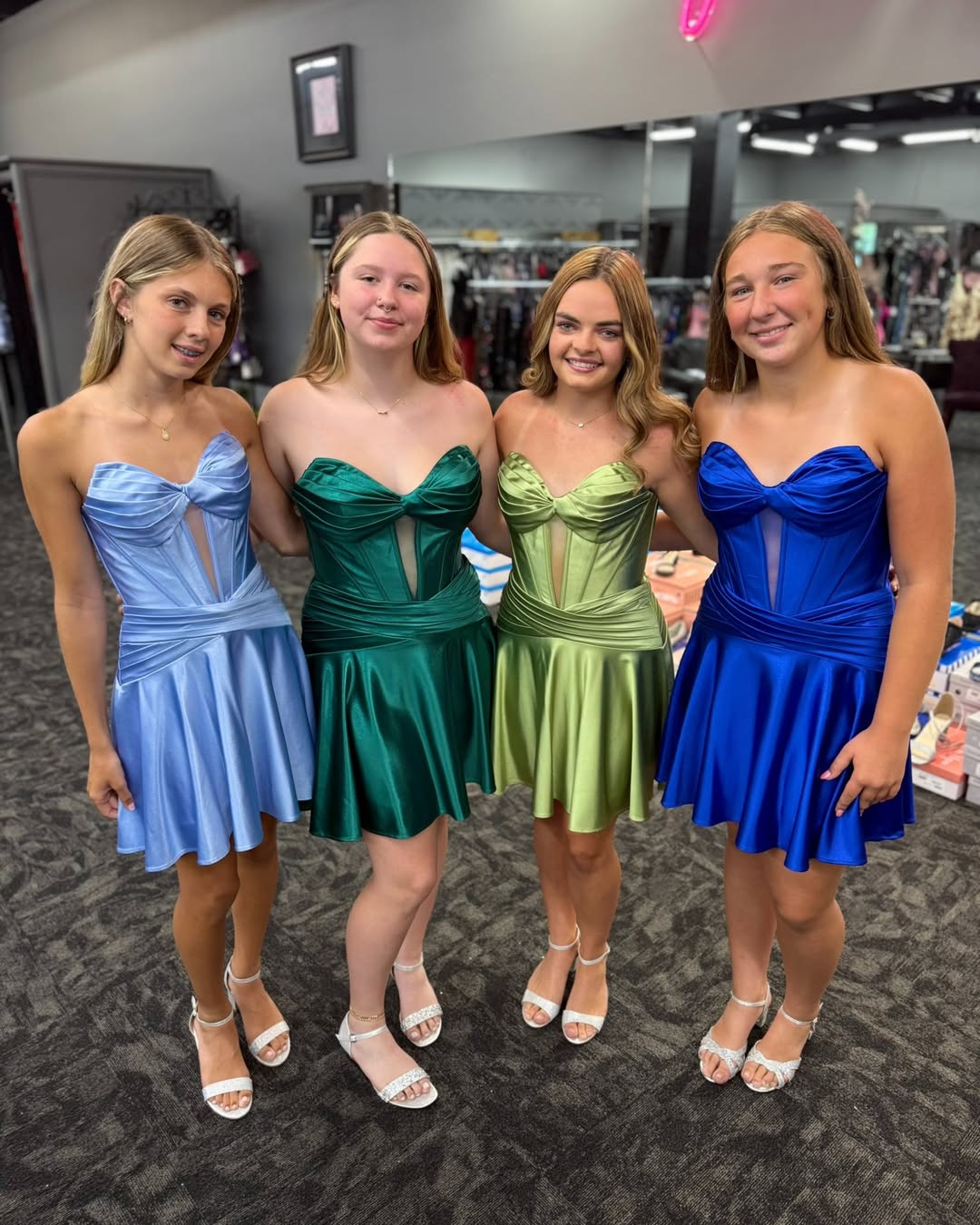This strapless black homecoming dress features a sleek bodycon silhouette crafted from smooth satin fabric, offering a flattering fit that accentuates your curves. Its sleeveless design and subtle keyhole detail add a touch of elegance and modern sophistication, making it an ideal choice for formal events and special occasions. The dress combines classic style with contemporary elements to ensure you stand out with confidence and grace.